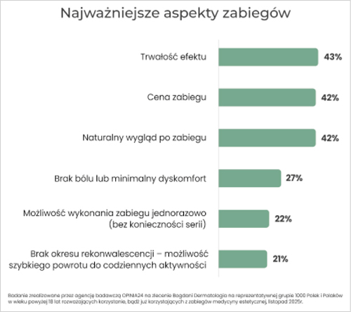 Choć koszt zabiegu nadal jest ważny, pacjenci znacznie częściej wskazują na trwałość efektu i naturalny wygląd jako czynniki decydujące o wyborze. To ogromna szansa dla kosmetologów,którzy potrafi ą jasno wytłumaczyć, dlaczego dana terapia wymaga czasu, serii lub wsparcia pielęgnacją domową.