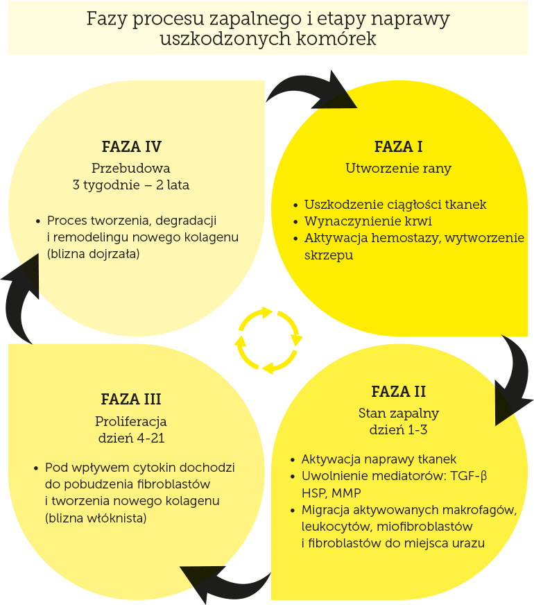 Skąd wiemy, że powstaje stan zapalny miejscowy? Ciało jest lekko zaczerwienione, można odczuwać szczypanie, pieczenie, skóra jest miejscowo bardziej twarda (obrzęknięta), a co najważniejsze – jej funkcje są zaburzone. Przy dużej powierzchni podrażnienia samego naskórka odczuwalne jest podwyższenie temperatury. To wszystko świadczy o stanie zapalnym miejscowym, który w sprzyjających warunkach powinien ulec samoistnemu wyciszeniu w ciągu 2 dni, a naskórek powinien zregenerować się poprzez epitelizację.